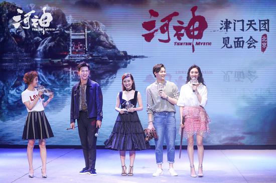 李現、王紫璇、張銘恩、陳芋米等四位主演在見面會上以各自角色造型亮相,道具、技能等身份線索的曝光,讓現場的迷弟迷妹大飽眼福。李現還大方展示健身成果,好身材惹得粉絲尖叫連連。張銘恩則笑稱自己的化妝時間都用在維護“卷毛”上了。天團還分享了“齊練潛水”的有趣經歷,再次拉近了粉絲和《河神》的距離。
