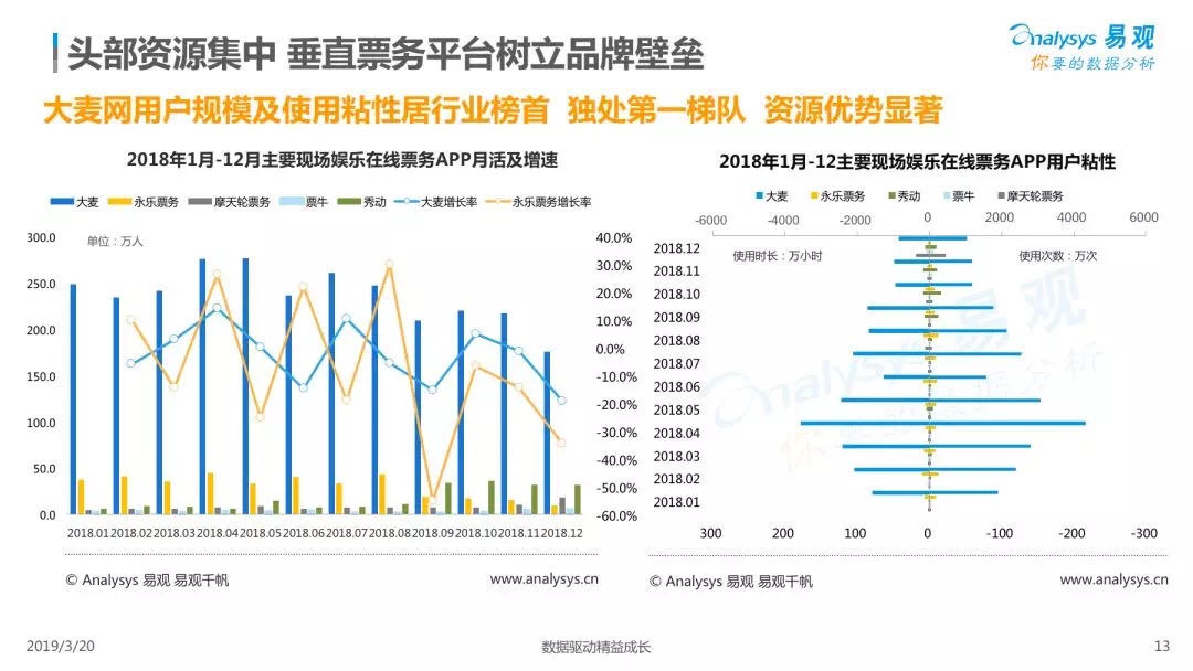 2019年3月20日,國(guó)內(nèi)第三方數(shù)據(jù)公司易觀發(fā)布《2018中國(guó)現(xiàn)場(chǎng)娛樂(lè)票務(wù)市場(chǎng)年度綜合分析》(以下簡(jiǎn)稱“報(bào)告”)。報(bào)告顯示,2018年,大麥網(wǎng)獨(dú)處第一梯隊(duì),其用戶規(guī)模、使用粘性、行業(yè)獨(dú)占率及行業(yè)滲透率均居行業(yè)榜首,生態(tài)優(yōu)勢(shì)顯著。