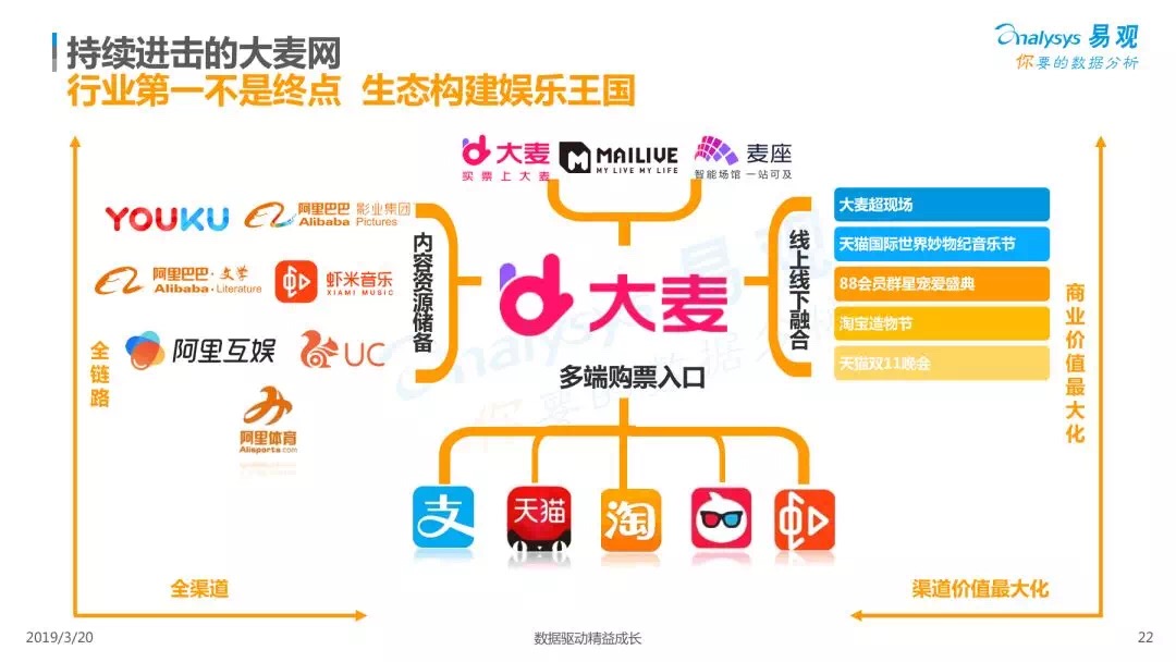 報(bào)告稱,經(jīng)過(guò)十多年的深耕運(yùn)營(yíng),大麥網(wǎng)已經(jīng)從早期的現(xiàn)場(chǎng)娛樂(lè)票務(wù)銷售平臺(tái),迅速進(jìn)化為集內(nèi)容分發(fā)、用戶服務(wù)、智能營(yíng)銷、場(chǎng)館解決方案執(zhí)行落地于一體的全產(chǎn)業(yè)鏈綜合服務(wù)提供商??v觀其產(chǎn)業(yè)布局,不斷創(chuàng)新升級(jí)的敏銳嗅覺(jué)和緊隨市場(chǎng)變化的超前意識(shí)加固著大麥網(wǎng)多方領(lǐng)先的絕對(duì)優(yōu)勢(shì)。“未來(lái),其更大的想象空間在于更深入聯(lián)動(dòng)阿里文娛生態(tài)版塊及產(chǎn)業(yè)上下游,在拓展存量市場(chǎng)價(jià)值最大化的同時(shí),延伸行業(yè)邊界,挖掘中國(guó)現(xiàn)場(chǎng)娛樂(lè)更廣闊的增量市場(chǎng)空間。”報(bào)告預(yù)判。