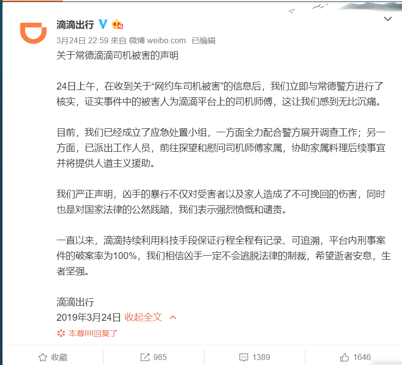 程維也感謝警方為陳師傅和家人討回公道,滴滴一定會為保護司機和乘客的生命財產安全不斷努力。