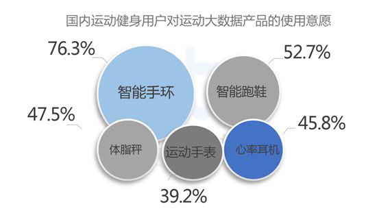 在國內運動健身用戶使用運動大數據產品類型的調研中,運動手環是目前最受國內健身人群歡迎的大數據產品,使用該產品的用戶占比已達到七成左右。智能手環功能豐富,能夠替代手表,而且非常輕便,適合佩戴,目前多家運動品牌以及互聯網公司在智能手環上布局。體脂秤也是用戶非常喜歡的運動產品,不僅能夠測量體重還可以測量脂肪、水分等,用戶能夠記錄身體多個運動數據。