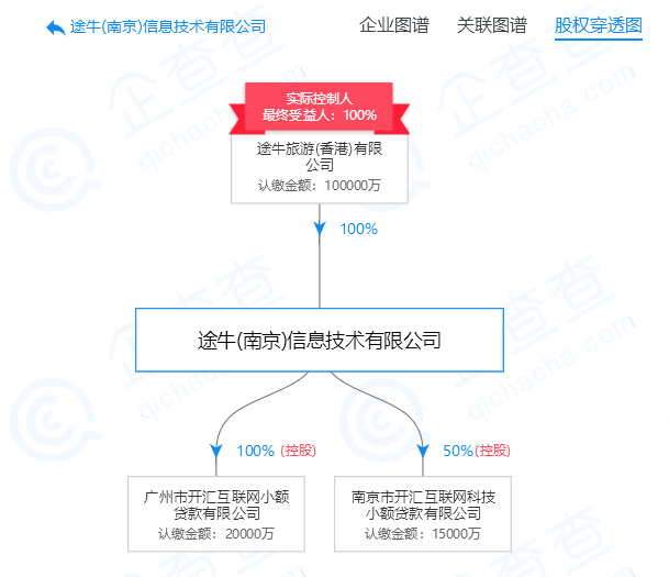 途牛(南京)信息技術有限公司成立于2011年8月,注冊資本10億元,大股東、實際控制人以及最終受益人均為途牛旅游(香港)有限公司,持股比例100%。