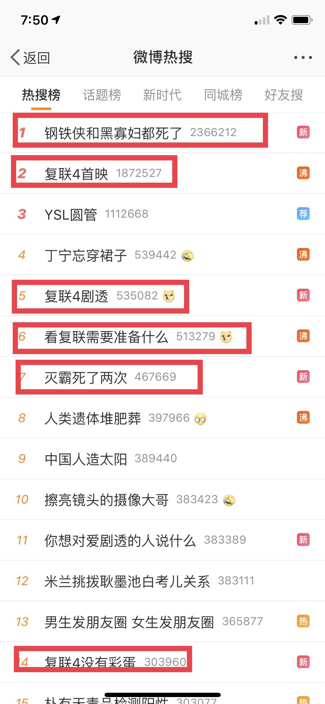 《復聯4》上映第一天就霸屏熱搜,微博熱搜秒成大型劇透現場。可以說,《復聯4》不僅是時下最熱門的電影,也是時下最熱門的話題。
