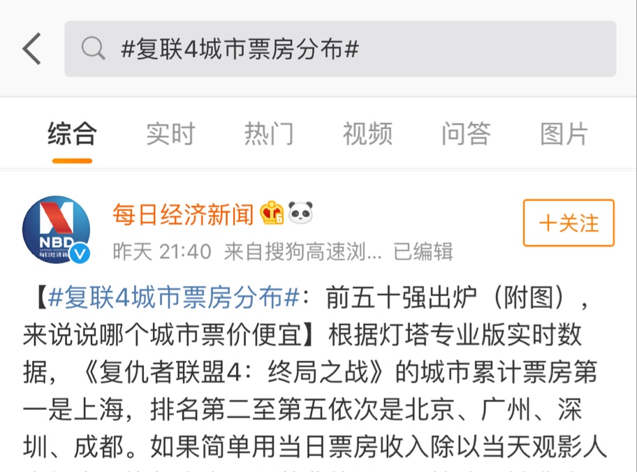 每日經濟新聞報道稱,上海毫無意外地占據了《復聯4》國內城市票房排行榜第一位。