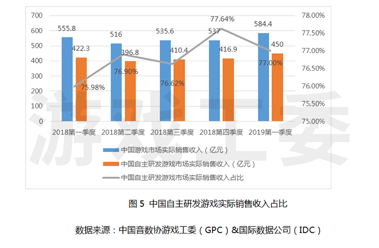 報(bào)告顯示,中國(guó)自主研發(fā)游戲?qū)嶋H銷售收入占比呈波動(dòng)上升趨勢(shì),從2018第一季度的76.0%上漲到今年第一季度的77.0%,相比2018年第四季度占比有所下降,但依舊保持市場(chǎng)收入的主導(dǎo)地位。