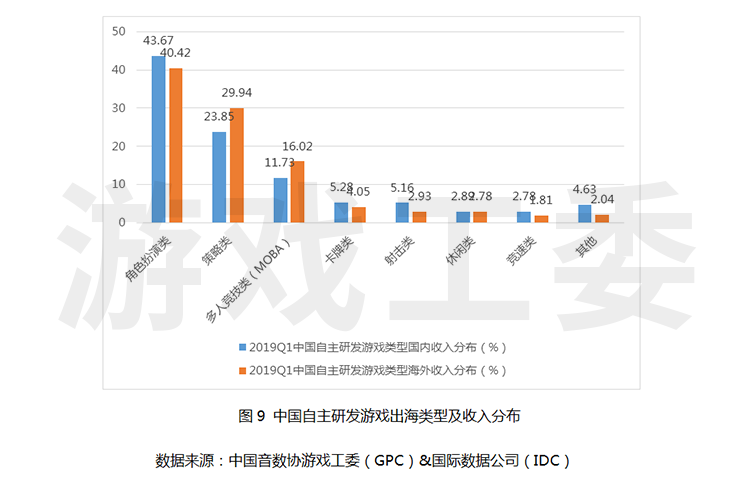 值得注意的是,2019年第一季度中國(guó)自主研發(fā)游戲海外總收入為30億美元,占據(jù)企業(yè)收入的30.9%,成為中國(guó)游戲企業(yè)重要的收入來(lái)源。出海游戲中,三類游戲較受歡迎,分別為角色扮演類、策略類和多人競(jìng)技類(MOBA)游戲;這三類游戲的收入合計(jì)占據(jù)海外總收入的86.3%。