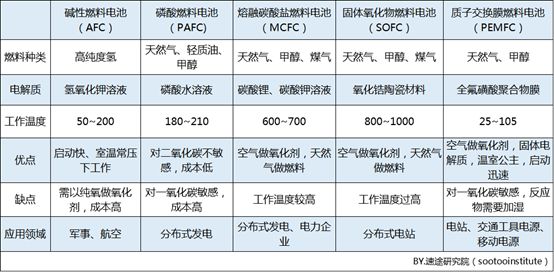 根據(jù)電解質(zhì)的不同,燃料電池又分為堿性燃料電池(AFC)、磷酸燃料電池(PAFC)、熔融碳酸鹽燃料電池(MCFC)、固體氧化物燃料電池(SOFC)和質(zhì)子交換膜燃料電池(PEMFC)5種。