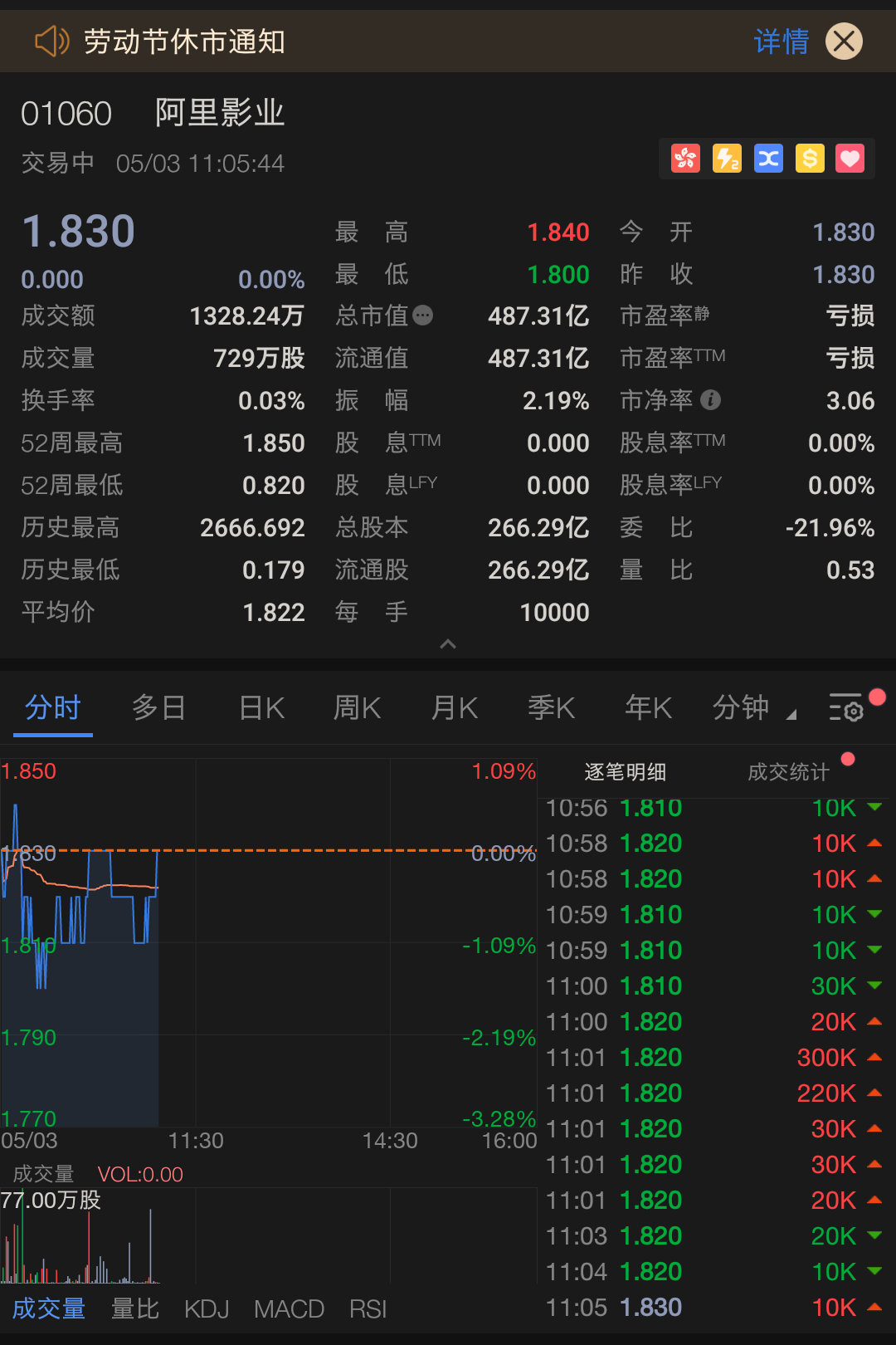 一系列業務探索的成功,也反映在了資本市場的認可上。5月3日,阿里影業股價維持了近日來的上漲態勢,股價盤中摸高1.84港元,創下2016年6月以來的新高,市值則接近500億大關。