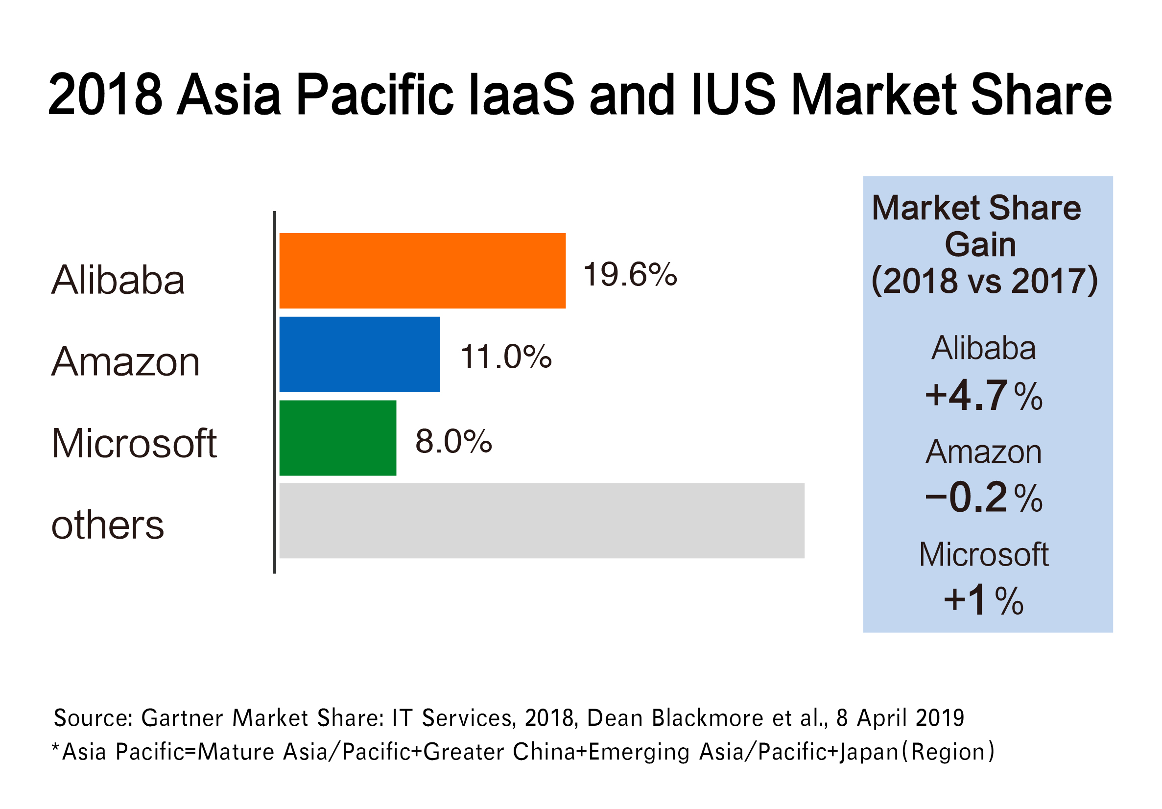 這些投入正在形成不斷擴大的市場優勢。據Gartner最新市場調研結果,過去一年,阿里云在亞太市場份額得到大幅提升。2018年阿里云在亞太市場排名第一,市場份額達到19.6%,比2017年的14.9%,增加了4.7個百分點。市場份額首次超越亞馬遜和微軟的總和。