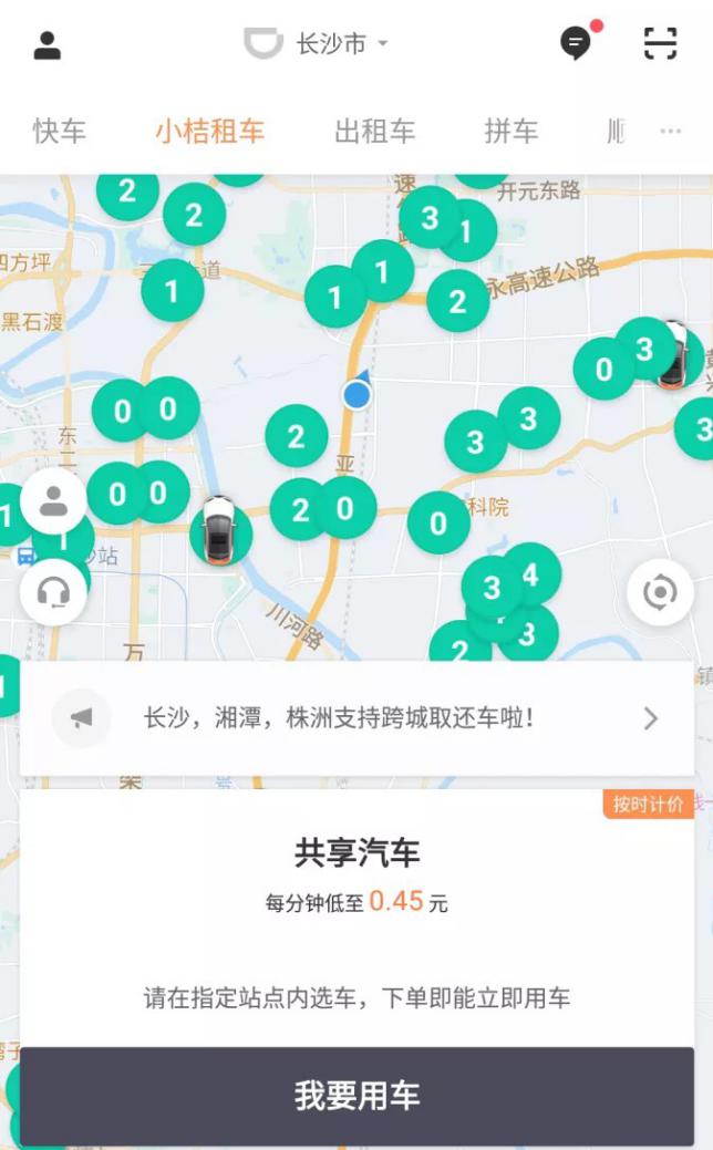 “長株潭”和“廈漳泉”兩大城市圈的用戶,都可通過滴滴出行App打開小桔租車,選取距離最近的網(wǎng)點自助取車,并在該城市圈任意城市網(wǎng)點還車,按使用時長付費。例如,從長沙火車站到株洲火車站,車程50余公里,用時約70分鐘,選擇共享汽車出行,按照當(dāng)?shù)?.45元/分鐘的計價標(biāo)準(zhǔn),全程僅需30余元。