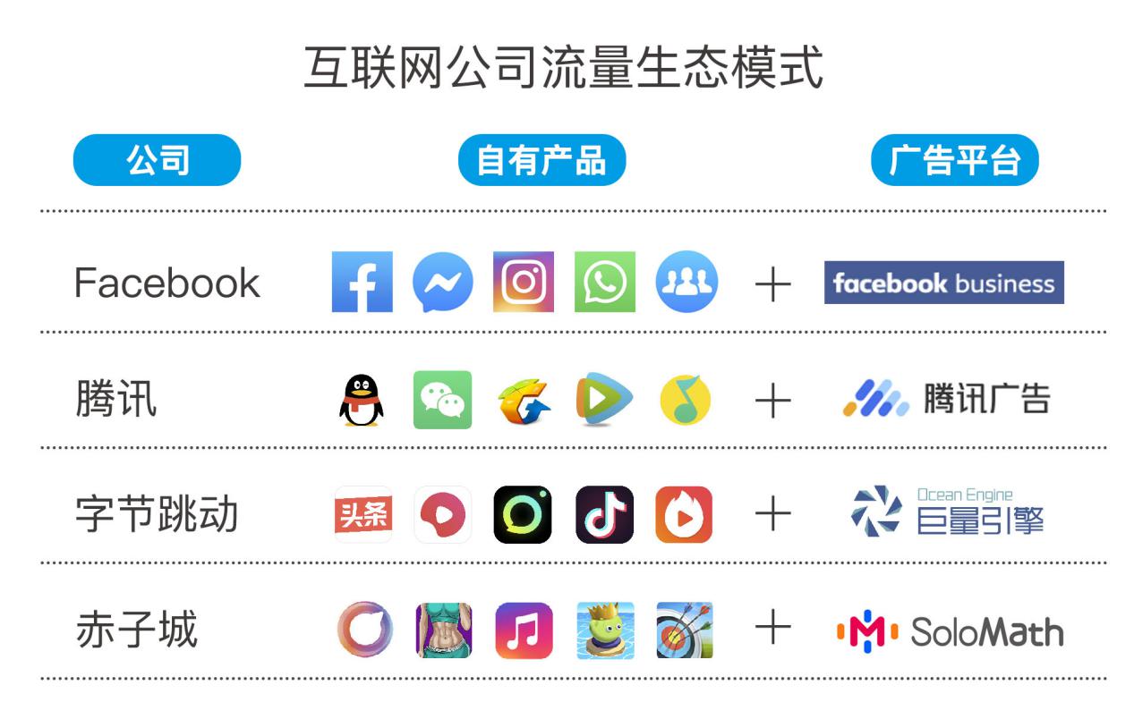 2014年,赤子城開始搭建其程序化廣告平臺,逐步升級為今天的Solo Math。對比國內的頂尖產品公司,騰訊推出了騰訊廣告,字節跳動搭建了巨量引擎,這樣的布局不難理解。