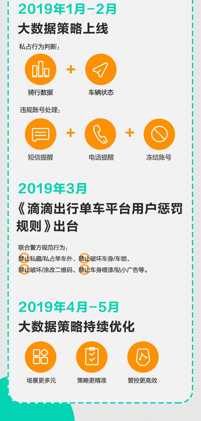 2018年12月,滴滴共享單車平臺“用戶舉報違規用車”入口上線,2019年1月,私占行為判斷的大數據評估策略上線,2019年3月《滴滴出行單車平臺用戶懲罰規則》出臺。對于涉嫌破壞、私占共享單車的用戶,滴滴共享單車平臺會首先通過短信、push推送、客服回訪等方式進行多次提醒,期間用戶可隨時與滴滴單車平臺客服溝通、反饋真實情況。