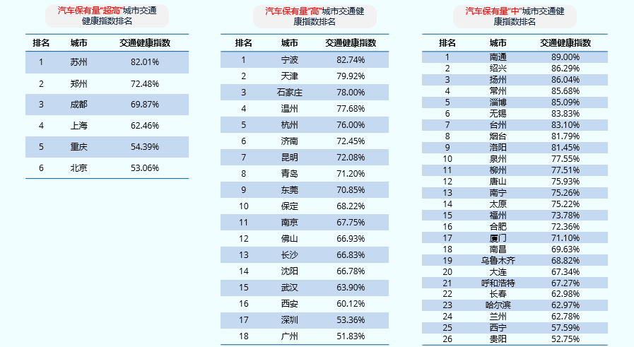 按汽車保有量劃分城市“交通健康指數”榜,汽車保有量“超高”的城市中蘇州交通健康指數最高,北京最低;汽車保有量 “高”的城市中寧波得分最高,廣州最低;汽車保有量“中”的城市南通得分最高,貴陽最低。