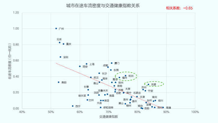 通過研究城市在途車流密度與交通健康指數的相關性發現,在途車流密度超高的城市,交通健康指數普遍較低,例如廣州、北京、重慶、深圳;但也有個別城市存在差異,如無錫、福州、杭州雖然在途車流密度高,但交通健康指數相對較好。