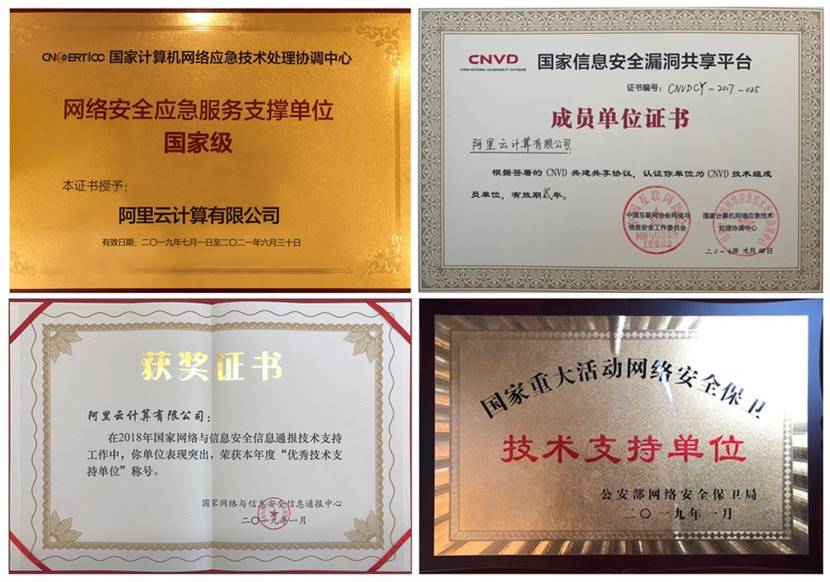 截止目前,阿里云已為四大國家級安全保障提供技術(shù)支撐,成為為國家級安全工作提供技術(shù)支撐最多的云服務(wù)商,包括:CNCERT網(wǎng)絡(luò)安全應(yīng)急服務(wù)支撐單位(國家級)、CNVD(國家信息安全漏洞共享平臺)技術(shù)組成員單位、國家網(wǎng)絡(luò)與信息安全信息通報中心技術(shù)支持單位(多年優(yōu)秀技術(shù)支持單位稱號)、國家重大活動網(wǎng)絡(luò)安全保衛(wèi)技術(shù)支持單位。