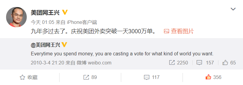 速途網7月29日消息(報道:吳佳馨)今日凌晨,美團網創始人王興轉發自己2010年所發的一條微博稱,九年多過去了,慶祝美團外賣突破一天3000萬單。