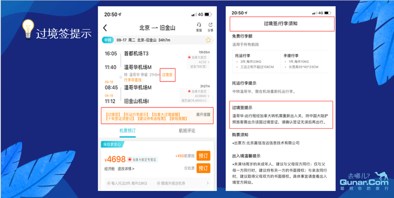 (圖說:去哪兒網平臺提醒出境用戶注意中轉過境簽辦理)?