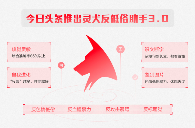 速途網7月30日消息(報道:吳佳馨)今日,今日頭條宣布正式推出新版“靈犬反低俗助手”,支持對圖片和文本進行識別。 這是時隔半年后,“靈犬”的又一次重要升級。
