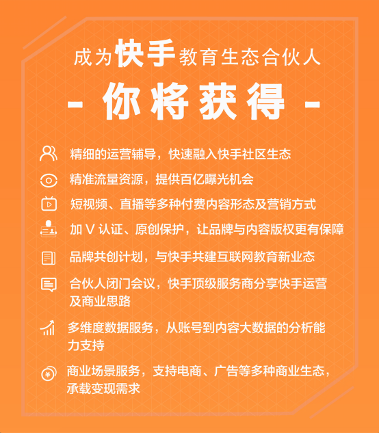 “此次推出的‘快手教育生態(tài)合伙人’計劃,將為參加的短視頻知識生產者提供精細的運營輔導,總計高達百億次曝光的精準流量資源,多維度大數據分析服務,以及電商、廣告、知識付費等多種商業(yè)變現(xiàn)場景,”快手教育生態(tài)負責人表示。