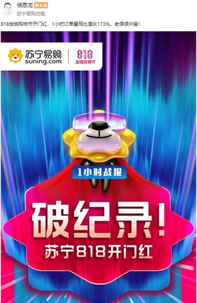 同一時間,蘇寧易購總裁侯恩龍更新微頭條:“818發燒購物節開門紅,1小時訂單量同比增長173%。老侯很興奮!”