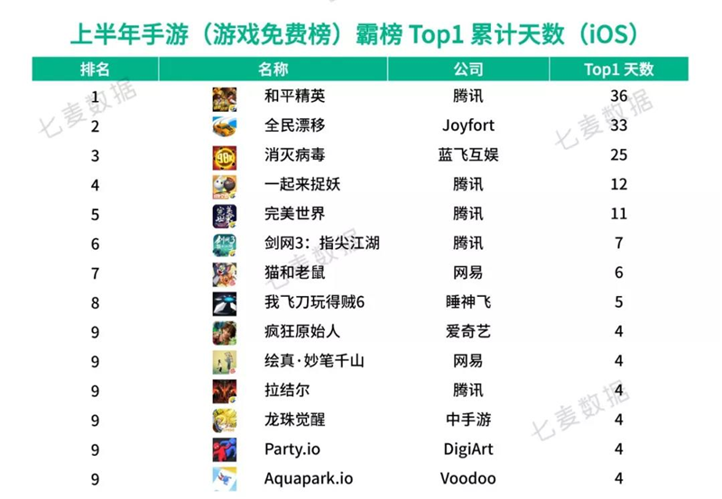 上半年游戲免費榜,騰訊3款游戲進入Top5成霸榜專業戶,旗下「和平精英」累計霸榜達36天;4款休閑游戲此次也出現在霸榜行列,「全民漂移」、「消滅病毒」進入Top3,與「和平精英」差距不大,休閑游戲優勢顯著。