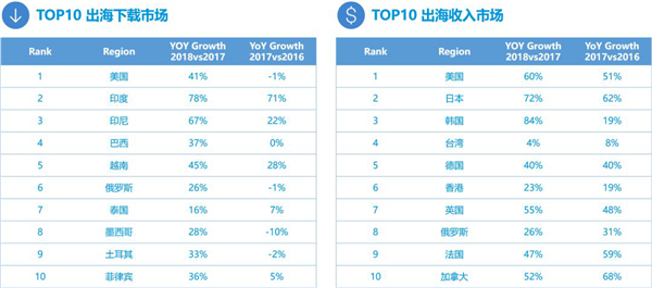 隨著國內(nèi)移動(dòng)游戲市場(chǎng)增速放緩,更多游戲公司選擇開拓海外市場(chǎng),但國產(chǎn)手游在海外的營收占有率僅有16%,發(fā)展空間巨大。亞太依然是出海的主力市場(chǎng),印度、印尼包括整個(gè)東南亞貢獻(xiàn)了可觀的下載量;日韓近兩年收入爆發(fā),增長速度超過50%,是亞洲的重點(diǎn)市場(chǎng),韓國更以84%的年增長率成為增長最快的海外市場(chǎng)。