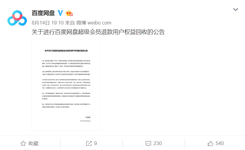 速途網8月15日消息(報道:喬志斌)昨日, 百度網盤官方剛剛發布關于進行百度網盤超級會員退款用戶權益回收的公告。