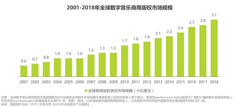2018年,中國的用戶端數(shù)字音樂市場(包含流媒體及其他數(shù)字音樂)收入規(guī)模占全球10.5%的市場份額,而企業(yè)端數(shù)字音樂(即表演權(quán)和同步權(quán)兩塊商用版權(quán))收入規(guī)模在全球總收入中不足1%。IFPI的數(shù)據(jù)顯示,全球數(shù)字音樂商用版權(quán)市場收入規(guī)模自2001年的6億美元增長至2018年的31億美元,即使整體音樂市場規(guī)模于此期間遭遇顯著下滑,但也維持著近20年的穩(wěn)定增長。這說明在市場監(jiān)管成熟的情況下,企業(yè)對于數(shù)字音樂商用版權(quán)的需求是剛需。中國數(shù)字音樂商用版權(quán)市場較全球發(fā)展而言雖處于起步階段,但隨著政策的監(jiān)管和市場的成熟,未來將會有十分可觀的增長空間,音樂版權(quán)交易平臺化也將成為趨勢,為行業(yè)發(fā)展帶來更多商業(yè)化動力。