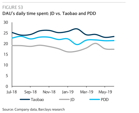 ▲報(bào)告顯示,拼多多年活躍買家數(shù)在2018年中期就已超過京東(圖表截至2019年3月)。