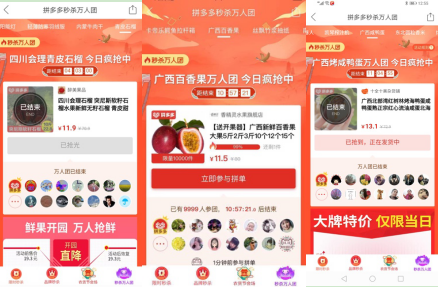 “9995,9999,搶光了!”8月25日13點,廣西百香果秒殺萬人團(tuán)售罄。農(nóng)貨節(jié)期間,廣西海鴨蛋、東北大米、寧夏枸杞、湖南零食大禮包、月餅、貴州紅心獼猴桃,四川會理石榴、廣西百香果等多個萬人團(tuán)遭瘋搶。大涼山會理石榴,更是太陽沒出來1萬單即被秒光,大量消費(fèi)者醒來想搶時即顯示“已結(jié)束”。