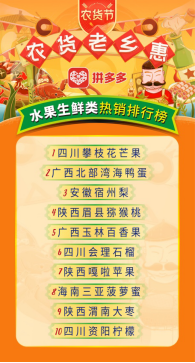 拼多多新出爐的農(nóng)貨熱銷榜顯示,作為國內(nèi)最靠前的水果大省,陜西和四川的果類占據(jù)了“水果生鮮榜”的半壁江山;而糧食主產(chǎn)區(qū)之一的東北,則是在“糧油沖飲榜”中獨占三席。排行榜鮮明反映出全國約500個農(nóng)產(chǎn)區(qū)“南果北糧”的產(chǎn)品特征。