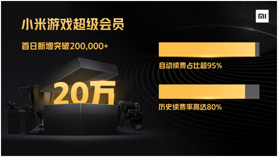 近日,上線2周的小米游戲超級會員也公布了答卷。從結果來看,該服務首日新增達20萬,自動續費用戶占比高達95%;收入方面,成為會員的用戶單天游戲內外貢獻流水破千萬。當前,超級會員人數仍在持續穩定增長,官方預計活躍會員數在2019年Q4將突破百萬。
