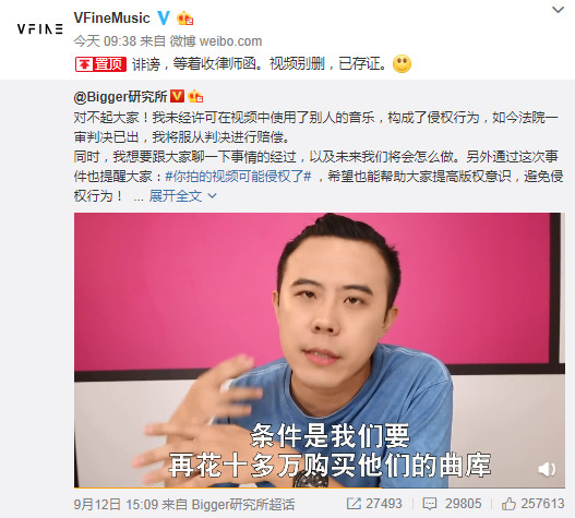 但VFine方面認為賠償金額不夠合理,將繼續上訴。而Bigger研究所也在近期發布的視頻中透露,VFine方面在開庭前提出過8萬元的私下和解要求,條件是要再花十多萬購買他們的曲庫。今日上午,VFineMusic官方微博轉發此視頻,并表示“誹謗,等著收律師函”。?