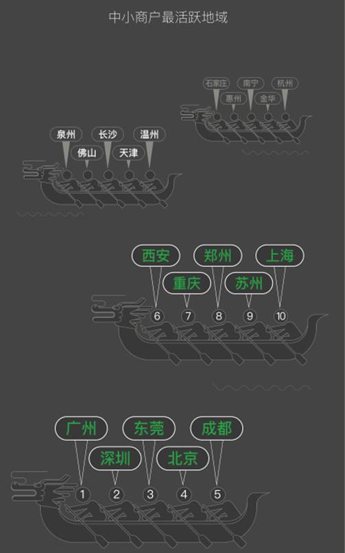除了行業(yè)的豐富覆蓋,微信支付的數(shù)字工具很大程度上消除了小商家發(fā)展的地域性差別。多個(gè)一二線城市與低線城市,呈現(xiàn)出齊頭并進(jìn)的趨勢。