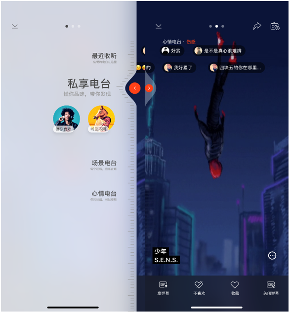 在歌曲播放頁,在保持用戶電臺后臺聽歌習慣的同時,用戶還可以上下滑動可以切換推薦歌曲,而歌曲背景則是與歌曲相關的視頻,讓你在不知不覺中,就沉浸在歌曲所營造的氣氛中。
