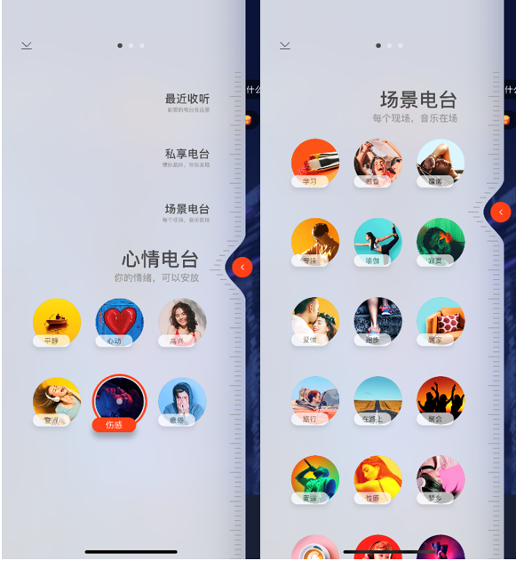 用戶隨心上下滑動標尺,便可在“最近收聽”、“私享電臺”、“場景電臺”、“心情電臺”等類別中順暢無縫切換。而向左滑動標尺則可以收起分類導航,就可以進入當前電臺歌曲播放頁,聽到由蝦米電臺為用戶推薦的歌曲。
