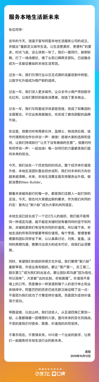 以下為阿里本地生活服務公司總裁王磊致員工信: