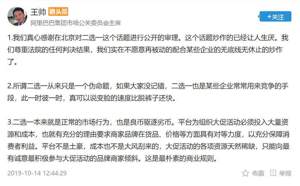 速途網10月14日消息(報道:李楠)今天中午,阿里巴巴集團市場公關委員會主席王帥在社交網絡中談及“二選一”。