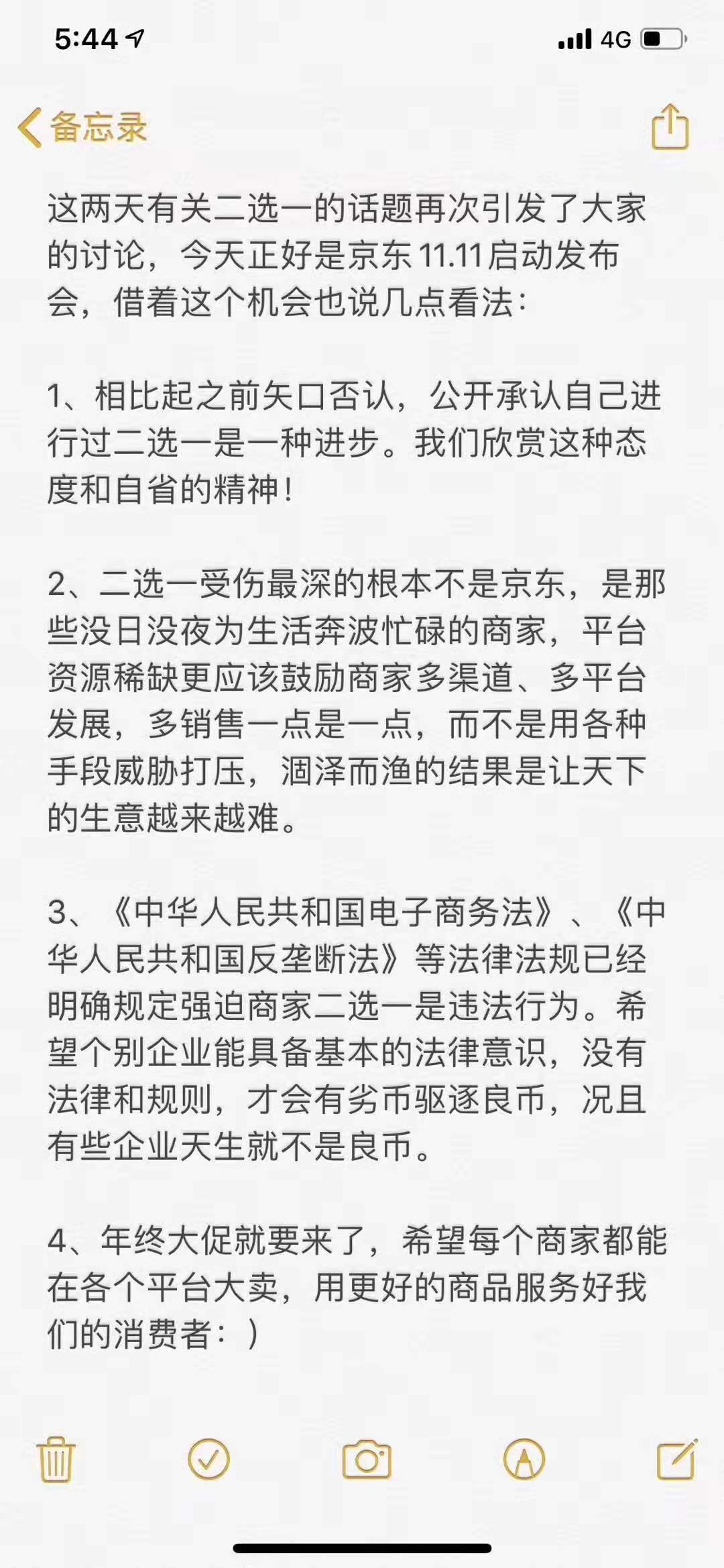他還稱,相比起之前矢口否認,公開承認自己進行過二選一是一種進步。我們欣賞這種態度和自省的精神!同時,《中華人民共和國電子商務法》、《中華人民共和國反壟斷法》等法律法規已經明確規定強迫商家二選一是違法行為。希望個別企業能具備基本的法律意識,沒有法律和規則,才會有劣幣驅逐良幣,況且有些企業天生就不是良幣。