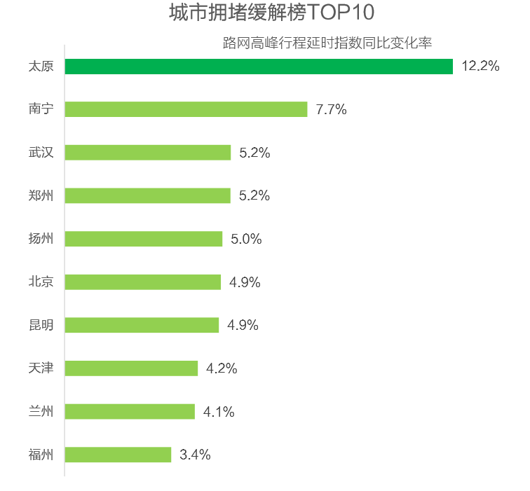 從本季城市擁堵緩解榜來看,太原路網高峰行程延時指數同比下降最大,達12.2%,其次是南寧和武漢。擁堵緩解的10個城市中有9個為直轄市或省會城市。