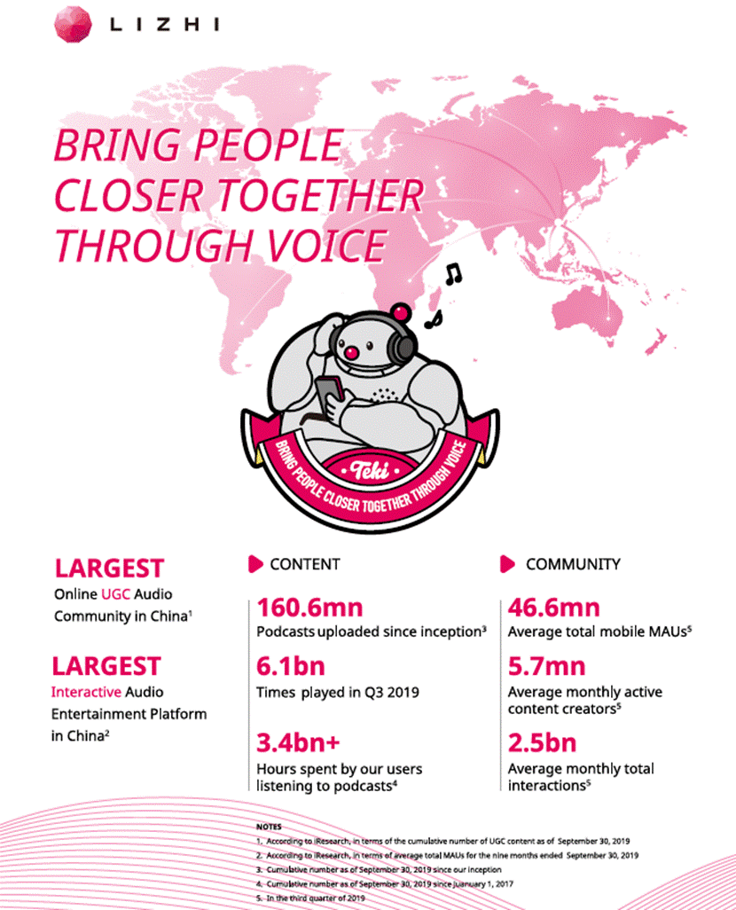 招股書還披露了荔枝的發展歷程:2013年創立后,提出“人人都是播客”,主打音頻創作工具和分享,2016年上線語音直播,2018年累計產生原創音頻節目超過1億期,2019年正式布局海外和IoT場景。