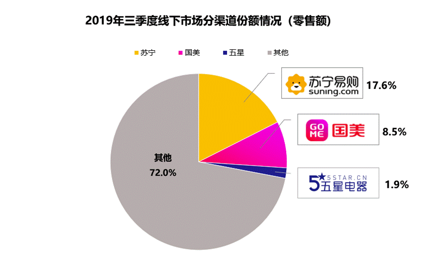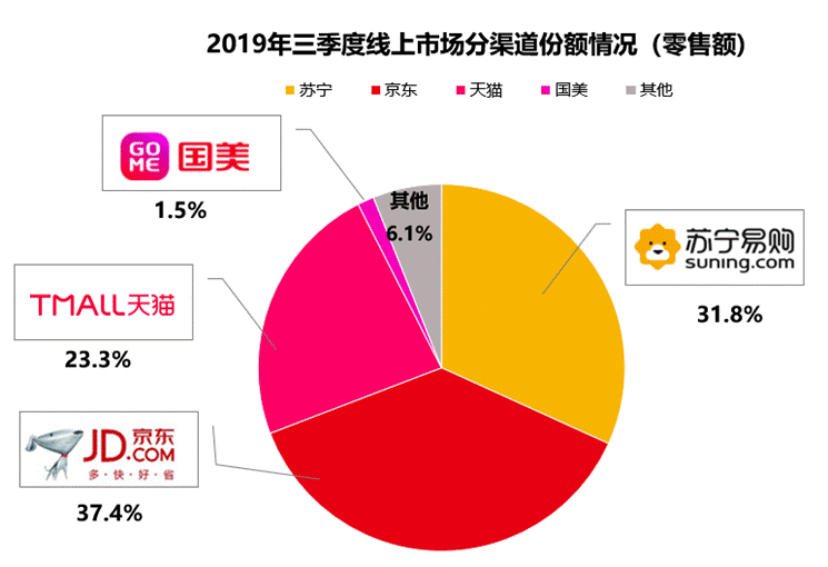 報告指出,2019年第三季度,中國家電市場零售額規模為1745億元。其中,蘇寧占比22.6%,份額持續擴大,再度領跑全渠道第一。京東占比13.4%,與蘇寧相差9.2%,差距進一步拉大。