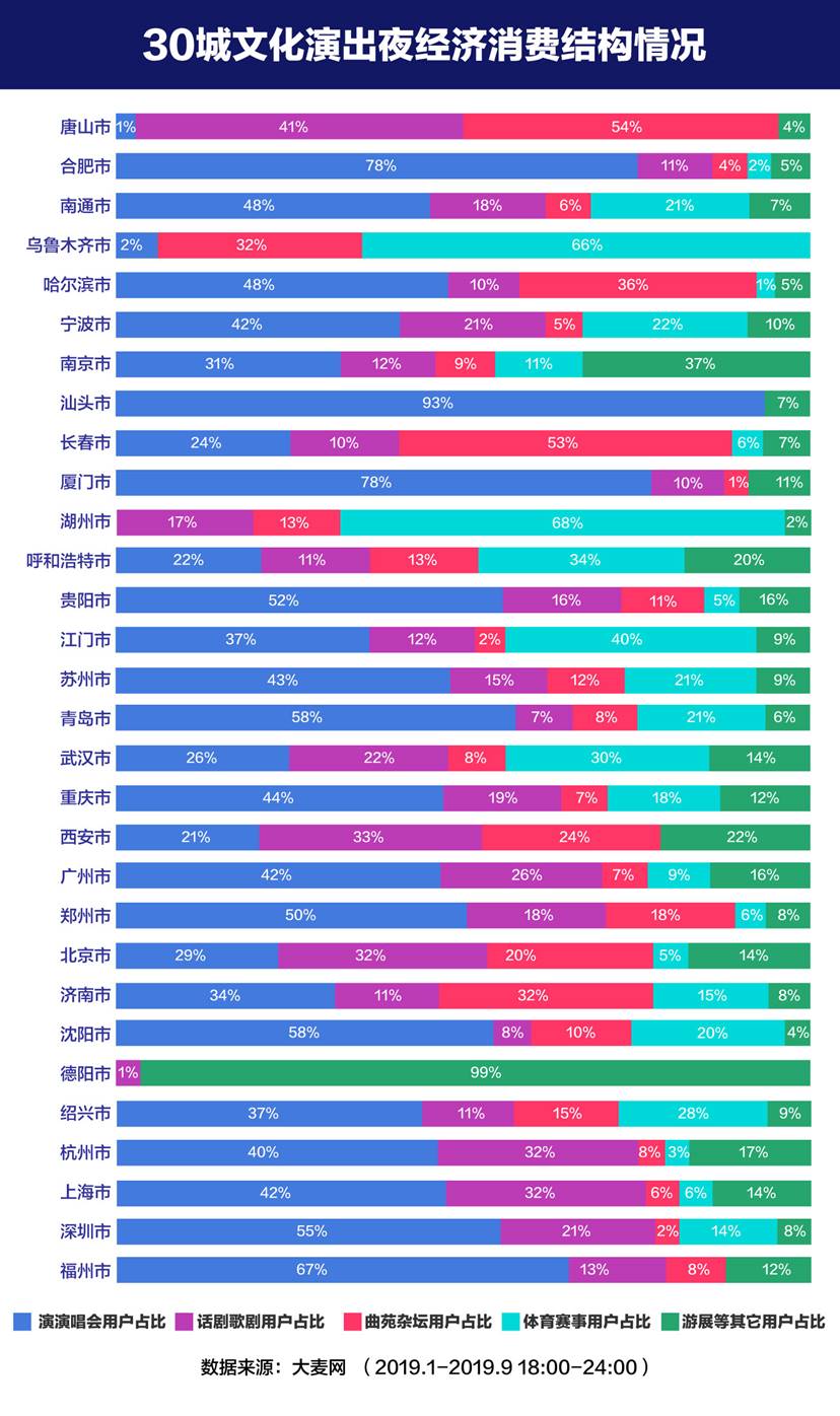 從消費結構上看,演唱會、話劇歌劇、曲苑雜壇、體育賽事四大品類市場消費強勁。合肥、汕頭、廈門等南方城市演唱會優勢明顯,扛起了整個城市文化演出夜經濟消費大旗,用戶規模高達70%以上;而唐山、烏魯木齊、長春、濟南等北方城市則是曲苑雜壇的市場占有率更高,用戶更愿意騰出晚上時間走進劇場。