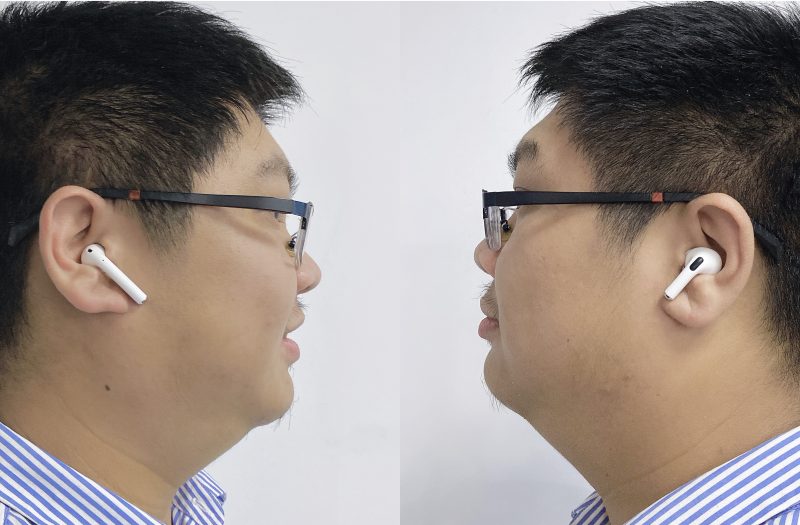 耳機形狀方面,AirPods Pro的“頭部”更大,“尾巴”卻更短了,在視覺上給人一種頭重腳輕的感覺,但實際上由于佩戴時,耳機頭部塞在耳內,內有硅膠套固定,外有耳廓進行支撐,佩戴起來非常牢固,不會因為甩頭或跑步而掉落。