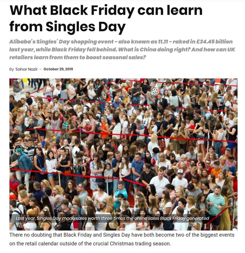 速途網訊 在近日英國零售專業媒體《零售報》(Retail Gazette)的報道中,英國零售業人士對西方的黑色星期五進行了仔細分析,指出從中國的天貓雙11當中有大量值得學習的內容。