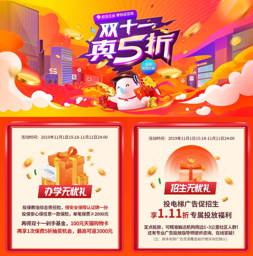 速途網11月5日消息(報道:李楠)今日,速途網獲悉,雙11已經滲透至教育行業,教育產業服務平臺、教育信息化綜合服務提供商——校寶在線在雙11期間,限時推出“雙十一真5折”。凡購買校寶學校管理系統3年使用時長,即再享3年免費時長。同時,校寶攜手花唄、平安產險、新潮傳媒等合作伙伴廣派“技術紅利”,推出社區電梯廣告1.11折、“校寶幫你還花唄”等辦學豪禮,以產業互聯網助力教培機構贏得雙11。