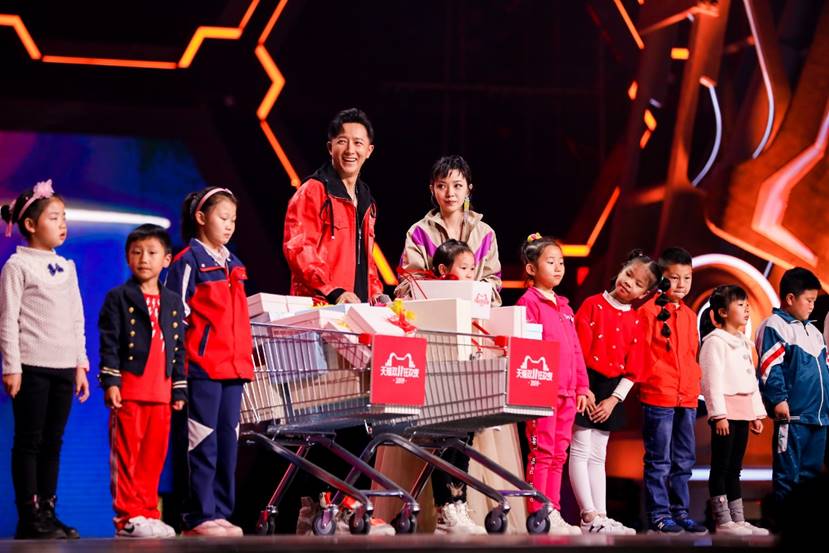 身為脫貧助力官的韓庚和郭采潔,將購物車里的禮物逐個交到孩子手中,讓孩子的小愿望在這個晚上“11實現”。