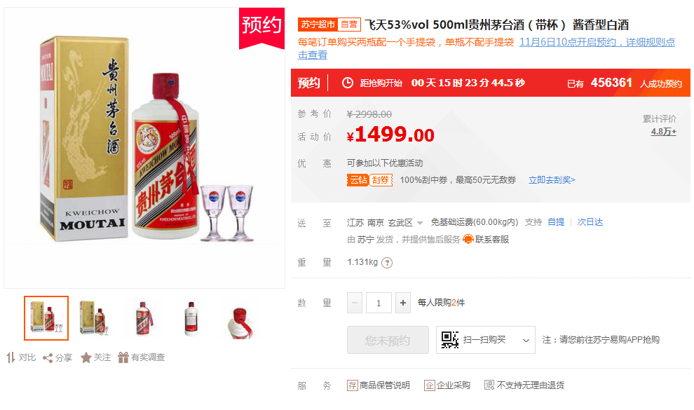 據悉,凡是之前預約成功但沒有搶到飛天茅臺酒的蘇寧實名認證super會員,都可以搶,每人限購2瓶。