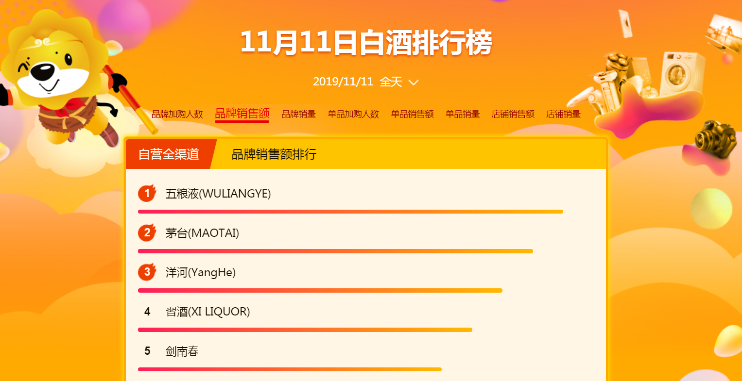 蘇寧超市訂單量同比增長287%,爆款產品整箱茅臺賴茅傳承藍53度同比增長637%,藍月亮洗衣液大包裝套裝同比增長283%,三只松鼠零食雙十一定制款大禮包銷售超過10萬包。11日當天,悟空榜數據顯示,白酒品牌銷售額排行榜上,五糧液、茅臺和洋河位居前三強。