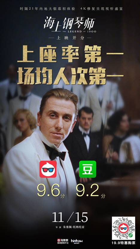 4K修復版《海上鋼琴師》于11月15日登陸全國院線,這部公認的影史傳奇,在技術修復后重新煥發出了光彩。作為首席營銷平臺,淘票票也在今年連續推廣《綠皮書》、《波西米亞狂想曲》、《何以為家》、《徒手攀巖》等奧斯卡獲獎(提名)影片之后,再次將一部影史經典推薦給中國觀眾,為電影市場提供了多樣化的優質外片內容。